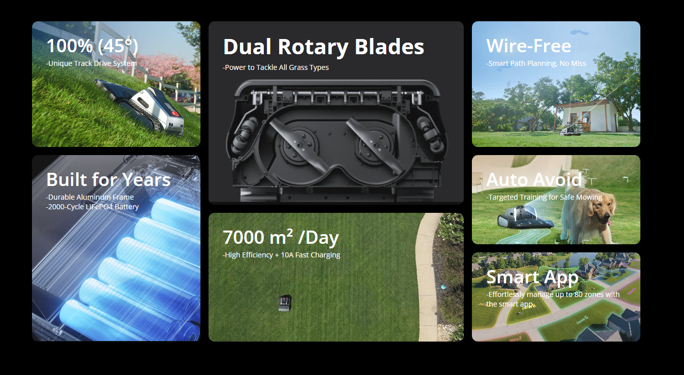 Built with dual rotary blades made from high-rigidity SK5 tool steel with 50 HRC hardness, Lymow One Plus maintains stable cutting performance in thick and tall grass, helping reduce missed patches and uneven results.